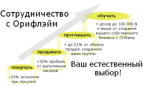 При размещении заказов от 3000 рублей в каталог, Вы сможете принять участие в Стартовой Программе для новых консультантов и получать наборы косметики со скидками от 83% и заработать около 5000р на этой акции. А при заказах от 5000 руб. вы получаете дополнительные привилегии, участвуя в акциях Бизнес-класс и Профи-клуб Орифлейм.В качестве поощрения Вы можете рассчитывать на подарки для консультантов Орифлейм.